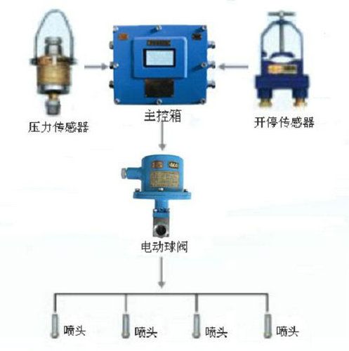 只有水壓傳感器檢測到采煤機水采水路中有一定的水壓(或工作燈開啟)時,才能允許啟動采煤機。采煤機開動后,開停傳感器(或光控傳感器)將信號送入主控箱,主控箱控制電動球閥開啟,實現對產塵點進行噴霧降塵。采煤機停機(或采煤機工作燈關閉)后,主控箱控制電動球閥延時一定的時間后關閉,停止噴霧降塵。